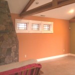 This interior painting project had a beautiful, stone fireplace in the middle of the room. The last thing you want to do is speckle paint on the stone! Before any painting or work began all the furniture in the room was covered, and the fireplace was covered and taped off. The previous owner had painting the ceiling and had done a sloppy job resulting in numerous over painting marks right onto the nice wood beams! All the beams and exposed wood were sanded and then several coats urethane were applied. The ceiling was also repainted with two coats of Benjamine Moore Classic Regal Matte Finish ceiling paint.